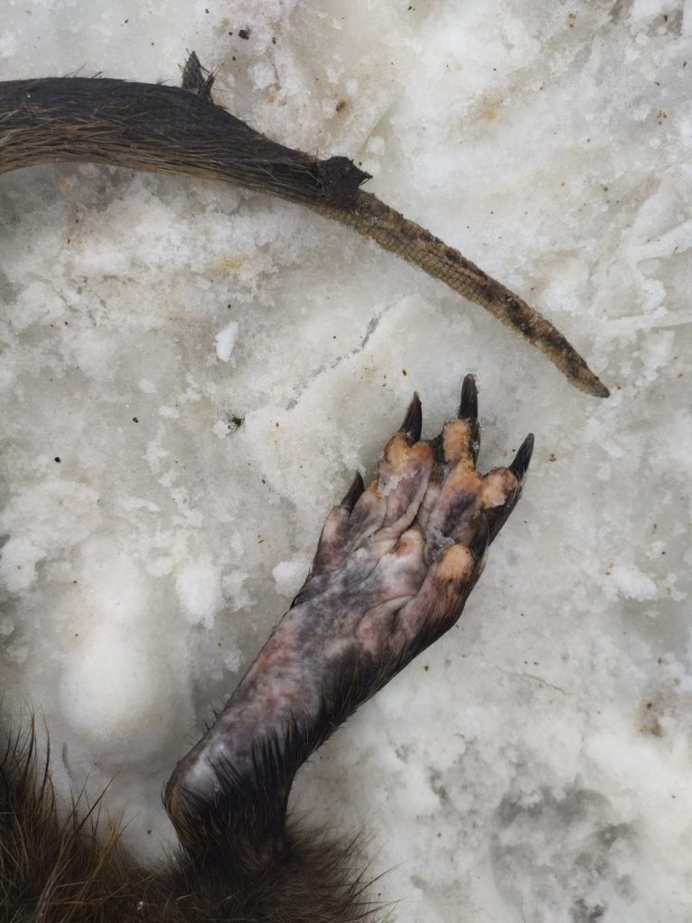 Schwanzspitze und Pfote einer Nutria mit Erfrierungen. Normalerweise ist der Schwanz bis zur Spitze behaart und die Pfote schwarz.